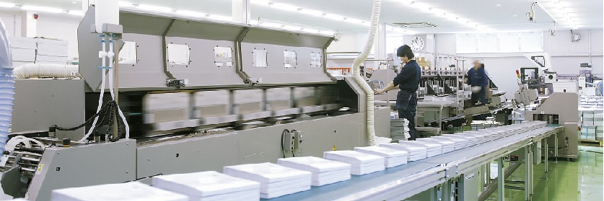トヨインの商品は印刷物だけではありません。お客様への最大のアプローチは、全工程を通しての管理システムと万全のサポート体制です。製造部の中枢となる生産管理課では、製造ラインおよびアウトソース、印材の手配まで全てを一元管理しています。また、営業との連携によりお客様からの希望納期・予算に合わせて、スケジュールや資材の提案も行います。製造後の仕分け・梱包、配送においても印刷特性を熟知したプロによる迅速・丁寧な作業を心がけています。生産管理課を中心とした品質管理と感謝を込めたサポート体制こそ、トヨイン最大のストロングポイントなのです。